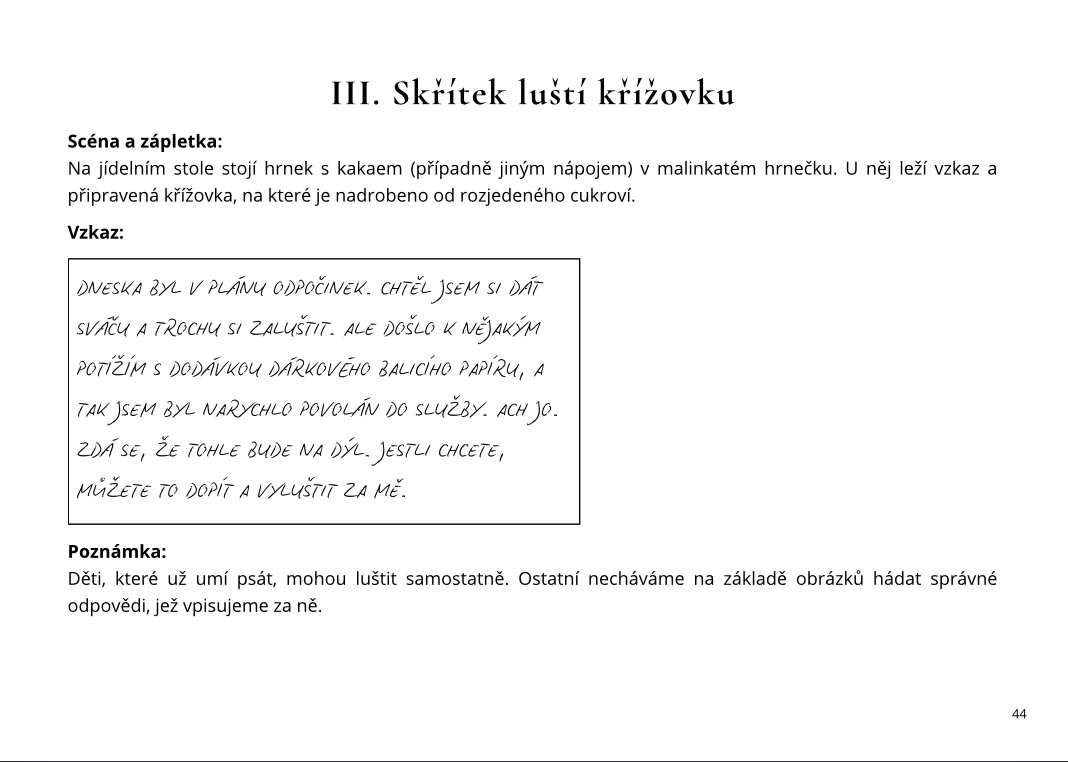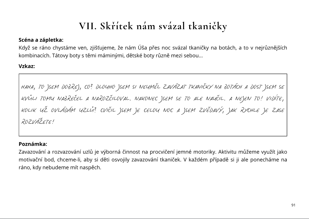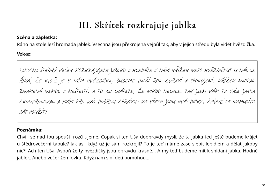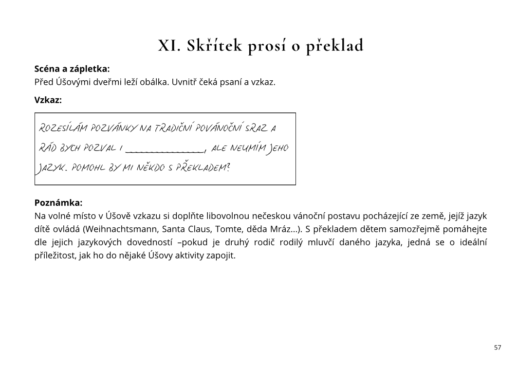 Publikace vychází ze severské tradice vánočních skřítků, kterou adaptuje na české prostředí. Krom toho, že vás do dané zvyklosti detailně zasvětí, se zaměřuje především na to, jak ji lze využít k prohlubování jazykových kompetencí. Obsahuje návody pro rodiče, více než 50 předpřipravených skřítkových vzkazů pro děti, úkoly, skřítkovy příběhy, pracovní listy a recepty… Zkrátka vše, co k obzvlášť kouzelnému adventu potřebujete!